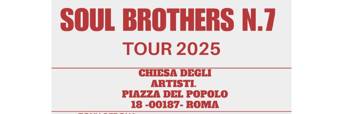 I SOUL BROTHERS N.7 SCELTI COME BAND DEL GIUBILEO DEGLI ARTISTI 2025. LINE UP: CHARLIE CANNON, MICHAEL MICK BRILL, CRISTIANA POLEGRI, BRERA'S KEY, TONY CERQUA, PAOLO RUSSO, LUCKY GARGIULO. Band che è stata scelta dalla Santa Sede per valorizzare la Musica delle tradizioni popolari, soprattutto: Gospel, Blues, Soul, Rhythm 'n' Blues, Funky