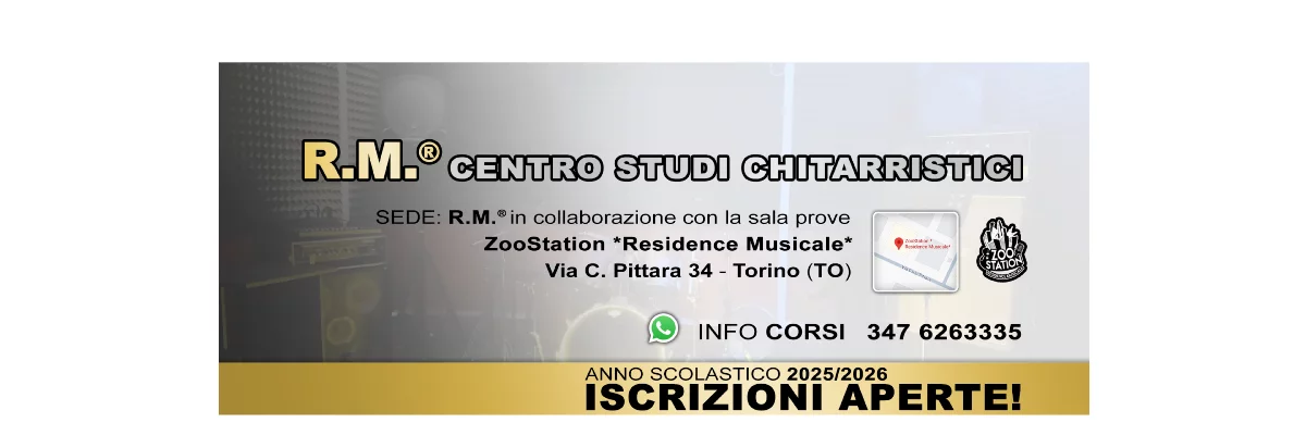 R.M.® Centro Studi Chitarristici è un'accademia specializzata nello studio della chitarra moderna. Si distingue per: qualità didattica dei corsi offerti, e per il "Metodo R.M.®" (innovativa tipologia di allenamento). Tel.347 6263335. Sede: via C.Pittara 34 -Torino, in collaborazione con ZooStation sala prove. Maggiori info alla sezione "Servizi".